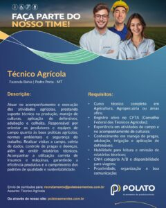 Requisitos Curso técnico completo Agricultura, Agropecuária ou em áreas afins; Registro ativo no CFTA (Conselho Federal dos Técnicos Agrícolas); Experiência em atividades de campo e no acompanhamento de culturas; Conhecimento em manejo de pragas, adubação, irrigação e aplicação de defensivos; Habilidade para leitura e emissão de relatórios técnicos; CNH categoria A/B e disponibilidade para viagens; Proatividade, organização e boa comunicação;